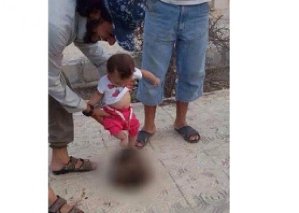 صورة صادمة +18.. داعشي يشجع طفله الرضيع على ركل رأس رجل مقطوعة