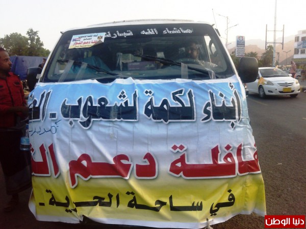ووصلت القافلة الثالثة القادمة من منطقة حجر بمحافظة حضرموت وعلى متنها ثلاثة طن من التمور وذلك دعماً لإخوانهم المعتصمين من أبناء الجنوب بساحة الحرية منذ 14 أكتوبر الماضي، للمطالبة باستقلال الجنوب واستعادة الدولة كاملة السيادة