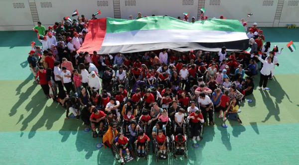 وسط فرحة عارمة رسم طلاب مركز راشد للمعاقين شكل القلب وهم يرفعون علم دولة الامارات استجابة لمبادرة صاحب السمو الشيخ محمد بن راشد آل مكتوم نائب رئيس الدولة، رئيس مجلس الوزراء، حاكم دبي "رعاه الله" للاحتفال بيوم العلم في الثالث من نوفمبر من كل عام.