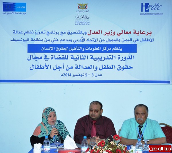 افتتحت اليوم بعدن الدورة التدريبية الثانية الخاصة بتدريب القضاة في مجال حقوق الطفل والعدالة من أجل الاطفال والتي ينظمها مركز المعلومات والتأهيل لحقوق الانسان بالتعاون مع وزارة العدل والمعهد العالي للقضاء وبدعم فني من منظمة اليونسيف وبتمويل من الاتحاد الاوربي ضمن مشروع ادماج مبادئ حقوق الطفل والعدالة من أجل الاطفال ضمن مناهج معهد القضاء العالي وتستمر الدورة لمدة ثلاثة ايام خلال الفترة من 3- 5 نوفمبر 2014.
