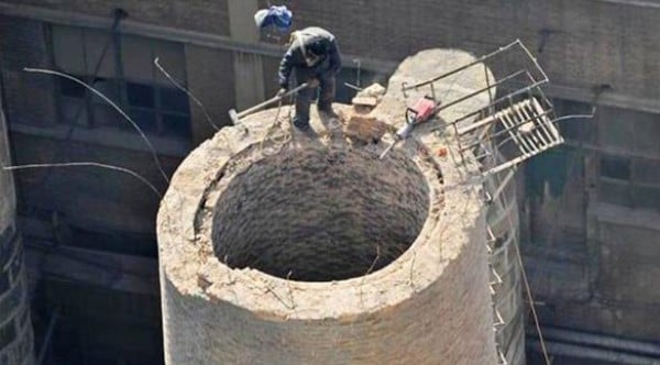 ويتعين على العامل تحطيم هيكل المدخنة البالغ ارتفاعه 45 متراً، باستخدام المطرقة والإزميل من الأعلى وصولاً إلى الأسفل، وذلك لتتمكن الشركة التي يعمل فيها من توفير المبالغ الضخمة التي تحتاجها عملية تدمير الهيكل بالمتفجرات.