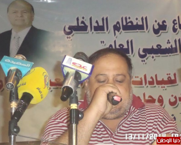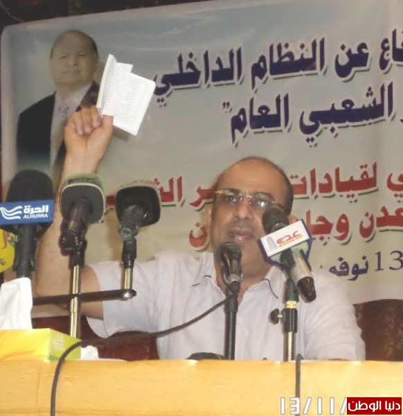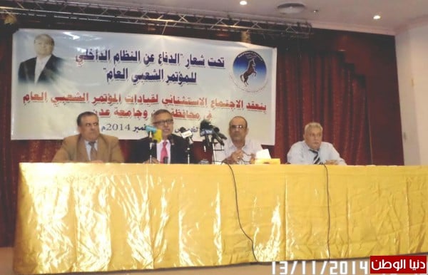 أكدت قيادات المؤتمر الشعبي العام بمحافظة عدن وجامعة عدن اليوم الخميس (13 نوفمبر 2014م)، رفضها للإجراءات التي تمت في دورة اللجنة الدائمة للمؤتمر الشعبي العام المنعقدة بصنعاء، في تاريخ (8 نوفمبر 2014م)، والتي قضت باستبعاد فخامة رئيس الجمهورية/ عبدربه منصور هادي النائب الأول للمؤتمر الشعبي العام، والدكتور/عبدالكريم الأرياني النائب الثاني للمؤتمر الشعبي العام من منصبيهما، بما يخالف نص المادة (26)، من النظام الداخلي للمؤتمر فقرة (4)، التي نصت على انتخاب نائبي رئيس المؤتمر من المؤتمر العام..، وقالت القيادات في بيان أصدرته اليوم الخميس عقب عقدها اجتماعا استثنائيا لها بعدن، بانه لايحق للجنة الدائمة ان تسقط قرارات المؤتمر العام السابع للمؤتمر الشعبي العام..، مؤكدين هذه القرارات باطلة جملة وتفصيلا بوصف فخامة الرئيس/ عبدربه منصور هادي والدكتور/عبدالكريم الأرياني هامات وطنية وقيمية كبيرة، ودعائم تنظيمية أساسية في بنيان المؤتمر الشعبي العام، ورمزان سياسيان على مستوى اليمن والإقليم العربي والعالم.