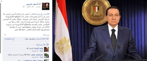 نفت صفحة "أسف ياريس" ما نشر من أخبار وتصريحات بدخول الرئيس المخلوع مبارك في غيبوبة تامة.