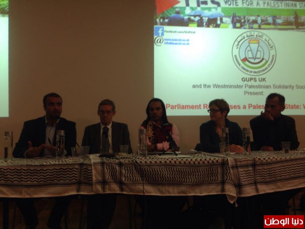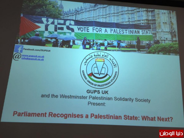 الى ذلك قال خالد التميمي نائب رئيس الاتحاد العام لطلبة فلسطين في برطانيا الى ضرورة تكثيف الجهود من اجل ضمان اعتراف حكومي بفلسطين كدولة ودعا التميمي كل المؤسسات المحبة لفلسطن والفلسطينية الى تشكيل تحالف يدعم المرشحين المحبين لفلسطين في الانتخابات العامة القادمة لضمان تمرير مشروع حكومي ينتهي باعتراف رسمي بريطاني بفلسطين.