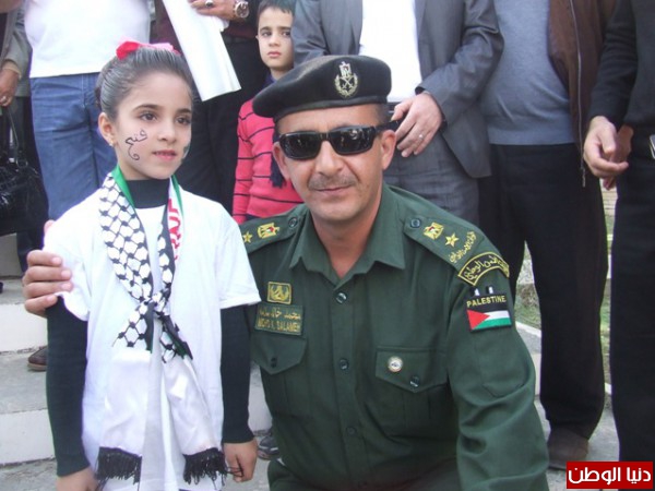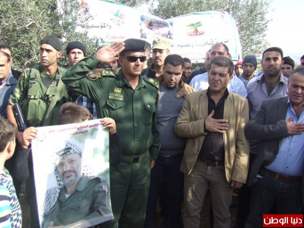 يرافقه مجموعة من الضباط وصف ضباط من قوات الأمن الوطني الفلسطيني في إحياء الذكرى العاشرة لاستشهاد الرمز ابو عمار من أمام المغارة التي انطلق منها في بلدة قباطية.