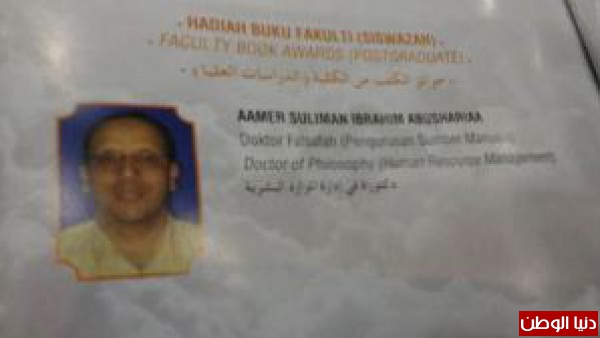 كان من المفترض ان يسافر الدكتور عامر ابوشريعه لتسلم شهادة الدكتوراه من جامعة العلوم الاسلاميه بولاية نيجري سمبلان في ماليزيا تخصص ادارة الموارد البشريه لتسلم شهادته ولكن بسبب اغلاق المعبر الرئه الوحيده لابناء شعبنا الفلسطيني ليمروا الى العالم الخارجي لم يتمكن من الخروج وتلقى اليوم اتصال هاتفي من رئيس الجامعة الاستاذ الدكتور داتو /موسى أحمد يبلغه بانه حصل على جائزة التفوق العلمي لعام 2014 وهي جائزه تمنح لطالب واحد كل عام وكان الطالب الدكتور عامر ابوشريعه الفلسطيني الذي حصل على هذه الجائزه من بين الاف الخريجين .
