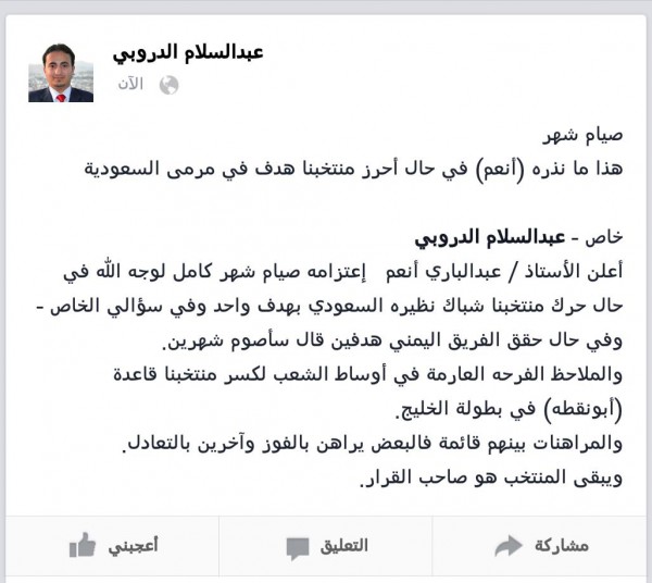 أعلن الأستاذ / عبدالباري أنعم إعتزامه صيام شهر كامل لوجه الله في حال حرك منتخبنا شباك نظيره السعودي بهدف واحد وفي سؤالي الخاص - وفي حال حقق الفريق اليمني هدفين قال سأصوم شهرين.