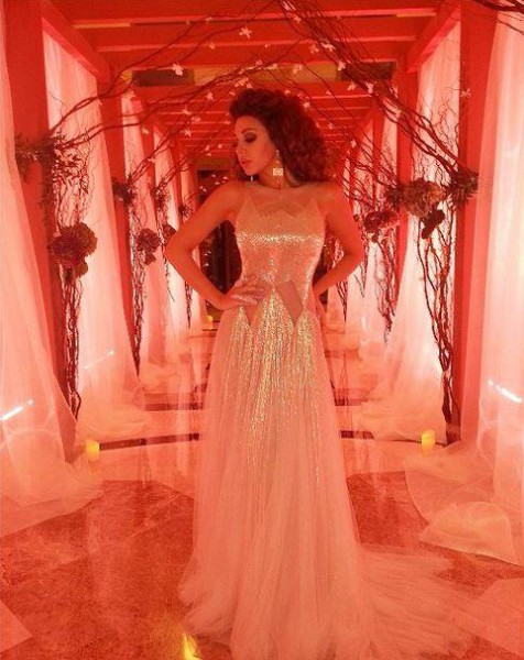 ميريام تألقت بفستان أبيض شبيه بفساتين الزفاف نافست به العروس، وزادتها المناطق الشفافة منه إثارة وجاذبية، كما تزينت بخواتم ماسية ضخمة أضفت عليها بريقاً ملكياً.