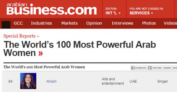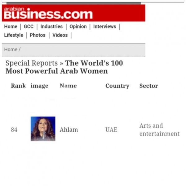 إحتلّت فنانة العرب أحلام الشامسي المرتبة 84 ضمن قائمة أكثر 100 إمرأة قوّة ونفوذ في العالم العربي في إحصاء أجراه موقع arabianbusiness وتضمّن سيدات من مختلف دول العالم.