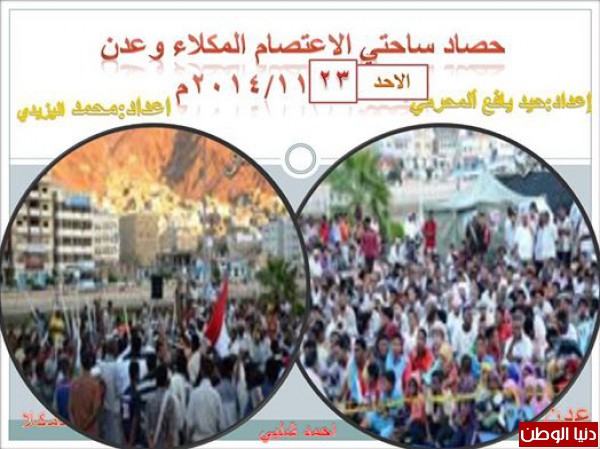 ليوم الأحد الموافق 23/11/2014 كانت ساحة الاعتصام بالمكلا على موعداً مع فعاليات ثورية كانت بدايتها في تقديم البرنامج اليومي ( الثورة الجنوبية في الصحافة المحلية والعربية والدولية) والذي ينتاول التغطيات الإعلامية والصحفية لدى وسائل الإعلام المحلية والإقليمية التي تطرقت إلى نضال وثورة شعب الجنوب السلمية التحررية.