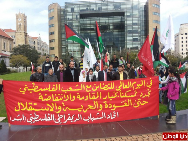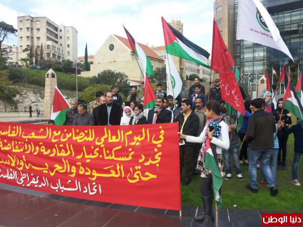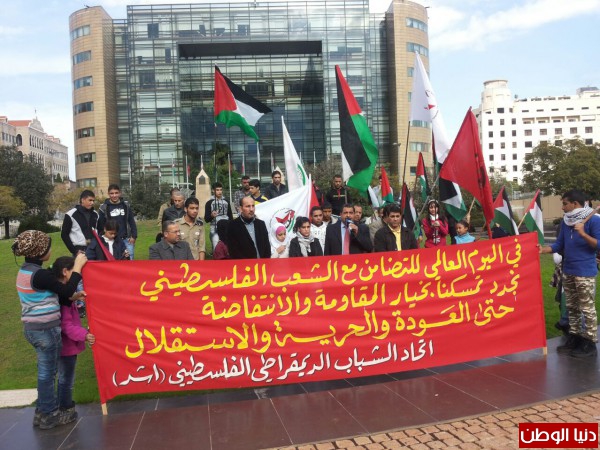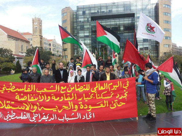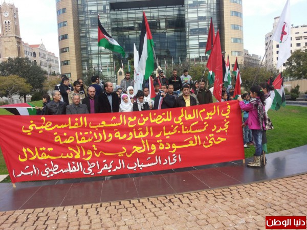 بمناسبة اليوم العالمي للتضامن مع الشعب الفلسطيني نظم اتحاد الشباب الديمقراطي الفلسطيني- اشد- اعتصاما شبابيا وجماهيريا امام مقر الامم المتحدة في بيروت – الاسكوا- بحضور ممثلين عن الاحزاب والفصائل والمنظمات الشبابية الفلسطينية واللبنانية وحشد من الشباب والطلاب الفلسطينيين.ورفع المشاركون الاعلام اللبنانية والفلسطينية ورايات اتحاد الشباب ولافتات تؤكد على التمسك بخيار المقاومة والانتفاضة.