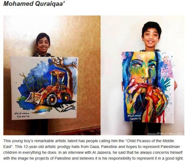 وتقول الوكالة وهي متخصصة بكل ما هو إبداعي ومميز إن قريقع يلقب ببيكاسو الشرق الأوسط بسبب موهبته الفنية المميزة رغم إنه لم يتجاوز الـ12 عاماً.