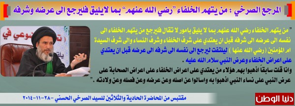 انتقد المرجع العراقي العربي السيد الصرخي الحسني بشدة من يصف ويتهم الخلفاء (رضي الله عنهم )بألفاظ فاحشة وبذيئة وتعبر عن الانحطاط الاخلاقي الذي يتصف به ذلك الشخص المسيء ومن يقف وراءه من مرجعيات السب الفاحش التي اسست للفحش والفساد والرذيلة واعتبر المرجع الصرخي الذي عُرف عنه كمرجعية معتدلة ان الاساءة للخلفاء ولعرض النبي صلى الله عليه واله كاشفا عن خلة بشرف هؤلاء المسيئين لعرض وشرف النبي "صلى الله عليه واله" ومن يريد ان يتإكد فعليه ان يسأل عنهم وعن اعرضهم واصولهم فستجدونهم بلا شرف معبرا عن ذلك بقوله " من يتهم الخلفاء رضي الله عنهم بما لا يليق بامور لا تقال فليرجع من يتهم الخلفاء الى نفسه الى عرضه الى شرفه قبل ان يعتدي على شرف الخلفاء وشرف النساء والى شرف السيدة ام المؤمنين (رضي الله عنها ) ليلتفت ليرجع الى نفسه الى شرفه الى عرضه قبل ان يعتدي على اعراض الخلفاء وعرض النبي سلام الله عليه .