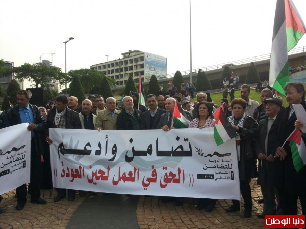تحت شعر تضامن و"أدعم الحق في العمل لحين العودة" نظم تحالف حق العمل للاجئين الفلسطينيين في لبنان والذي يضم إتئلاف حق العمل، لجنة العمل، منظمة العمل الدولية، الأسكوا، الأنروا ومؤسسة الدياكونيا، احتفالا جماهيريا حاشدا تضامنا مع الشعب الفلسطيني في لبنان وحقه في العمل وبمشاركة السفير سمير خوري وممثل سفير فلسطين خالد عبادي والمخرج روجيه عساف وممثل مؤسسة ديكونيا رودلف جبرايل ومنسقة حملة حق العمل ليلى العلي واعضاء تحالف حق العمل للاجئين الفلسطينيين في لبنان وممثلين عن الفصائل الفلسطينية والاحزاب اللبنانية والمؤسسات المحلية والدولية وعدد من المتضامنين الاجانب والاتحادات واللجان الشعبية وبحضور الآف من ابناء الشعب اللبناني والفلسطيني امام مقر الاسكوا وفي اقرب نقطة الى البرلمان اللبناني.