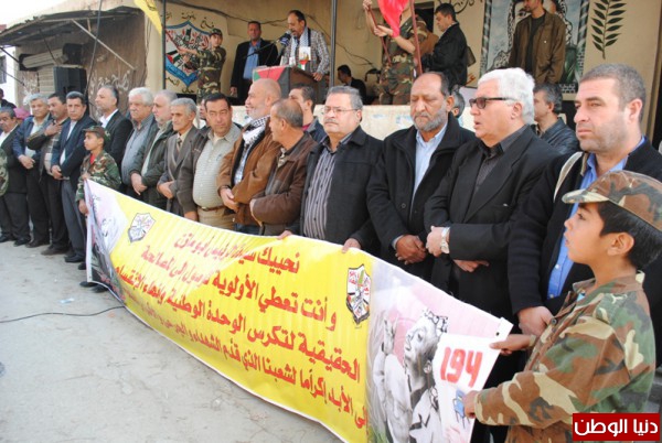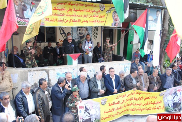 قال فيه:ا باسم الشعب الفلسطيني الذي يطالب بحقه في تقرير مصيره واقامة دولته الفلسطينية التي هي حق له كما هو حق لكل شعب بدون دولة ،تحية الى ابناء عين الحلوة نلتقي اليوم في يوم التضامن مع الشعب الفلسطيني التضامن لايكفى ليكون يوم تضامن ضد التأمر على الشعب الفلسطيني ,ان الامم المتحدة متحازه دائما مع الاحتلال وانها تغطي جرائم الاحتلال ،هذا اليوم هو ادانة للامم المتحدة والولايات المتحدةـ وان اقامة الدولة الفلسطينية هو بالمقاومة ,ونوجه التحية الى الشعب الفلسطيني , ان الشعب الفلسطيني اليوم حقق اعترافات دولية بدولته الفلسطينية ان يوم التضامن ,هو يوم واحد لايكفي نقول ان يوما واحدا لايكفي للتعبير مع شعب يعاني من جريمة العصراو للتعبير عن حقه لاعادة فلسطين ،فقد مر على نكبة فلسطين 67عاما ,,,ايها الاخوة كما قال الامام موسى الصدر ان اسرائيل شر مطلق ويجب ازالتها من الوجود وقال انا ضد الدولة السنية والشيعيه