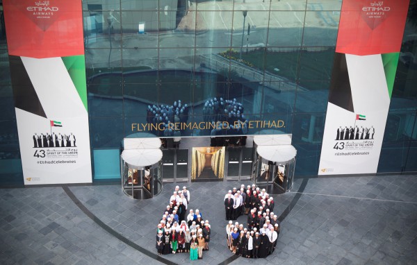 موظفو الاتحاد للطيران وطاقم الضيافة الجوية يحتفلون معاً باليوم الوطني الثالث والأربعين لدولة الإمارات العربية المتحدة في المقر الرئيسي للشركة بالعاصمة أبوظبي.