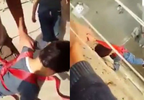 ويظهر في الفيديو، الذي انتشر على مواقع التواصل الاجتماعي، الوالد وهو يقوم بربط ابنه بالحبل ومن ثم يقوم باسقاطه عبر السطح المنزل.