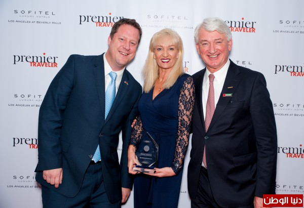 التعليق على الصورة: مسؤولو الاتحاد للطيران يتسلمون جائزة أفضل شركة طيران في الشرق الأوسط ضمن حفل توزيع جوائز 2014 الذي تقيمه مجلة بريميير ترافلر وهم من اليسار إلى اليمين: مايكل كوهلتسراند، نائب الرئيس لشؤون المبيعات – الساحل الغربي وأوبري تيدت، نائب الرئيس لشؤون خدمات الضيوف وخيرت بوفين، نائب رئيس أول لمكاتب الاتحاد للطيران في الأمريكتين.