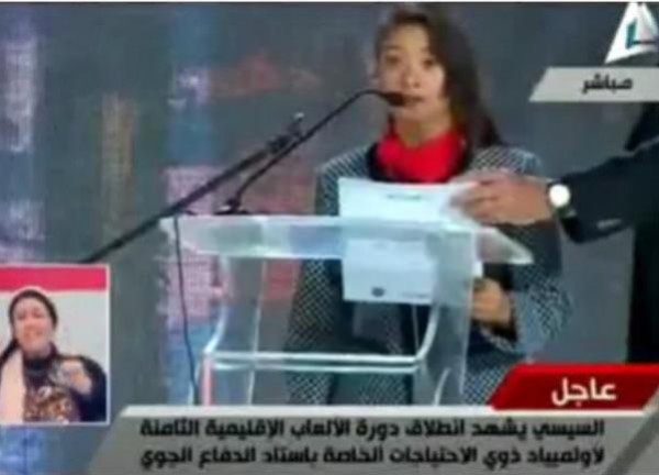 فاجئت إحدى الفتيات المشاركات في الحفل الافتتاحي لدورة الألعاب الإقليمية الثامنة للأوليمبياد الخاص لمنطقة الشرق الأوسط وشمال أفريقيا- القاهرة 2014، الرئيس عبدالفتاح السيسي أثناء إلقائها كلمة بالحفل قائلة له: «أنا بحيك يا سيسي وعايزة أسلم عليك». وقالت الفتاة أثناء إلقائها الكلمة، مساء الجمعة، «نتمنى للوفود إقامة سعيدة في بلادنا مصر أم الدنيا.. وأن نتعاون جميعا على إقامة دروة ألعاب ناجحة بإذن الله».
