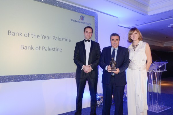 وجرى تسليم الجوائز خلال حفل كبير أقامته المؤسسة العالمية في العاصمة البريطانية لندن، حيث تسلم الجائزة السيد رشدي الغلاييني، نائب المدير العام لبنك فلسطين ممثلاً عن البنك. كما حضر الاحتفال حشد كبير من الشخصيات الريادية في القطاع المصرفي ومدراء البنوك والمؤسسات والصناديق المالية في الشرق الأوسط ومنطقة الخليج العربي. حيث اعتمدت المؤسسة على تحليل البيانات المالية ومؤشرات النمو والتطورات المتسارعة التي حققها البنك خلال فترة قصيرة، إضافة الى قصة نجاح البنك وتوسعه وانتشاره وأدائه في العام الماضي، حيث حقق أرباحاً صافية بلغت حوالي 40.5 مليون دولار أميركي.