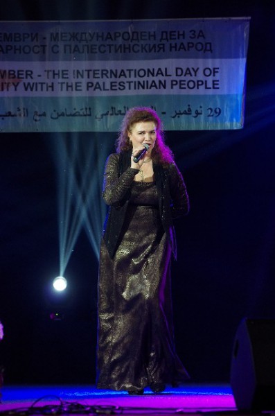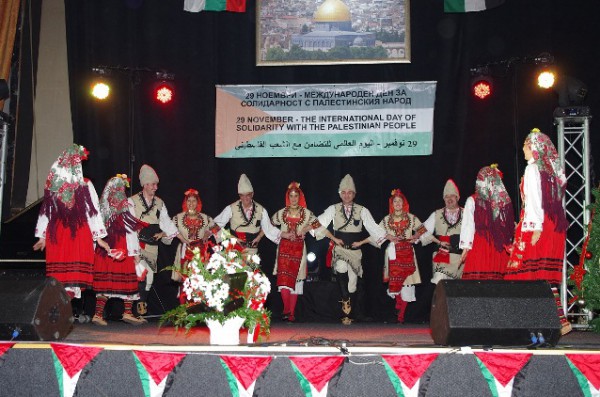 واستمر احتفال التضامن مع الشعب الفلسطيني ببرنامج فني شاركت فيه عدة فرق فنية، حيث شاركت فرقة كيريل خارالامبييف للفنون الشعبية والتراثية البلغارية، ومجموعة الفنون سلافينا، وفرقة المعهد الوطني للموسيقى في صوفيا، وفرقة سيلرفر بيت، والمطربة راييسا بوليكوفا، والفرقة الكوبية البلغارية للرقص، وفرقة القدس للدبكة الشعبية والتراثية الفلسطينية، كما اطرب الحضور الشاب الفلسطيني بهاء كعوش الذي عزف على آلة القربة عدد من المعزوفات الفلسطينية مثل "علي الكوفية" و "وين ع رام الله" وعددا آخرا من المعزوفات التي لاقت حماسا كبيرا من الجمهور الذي تفاعل مع الاغاني.