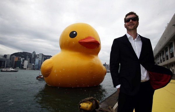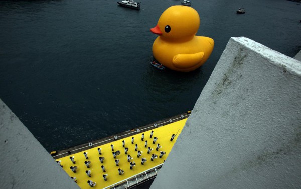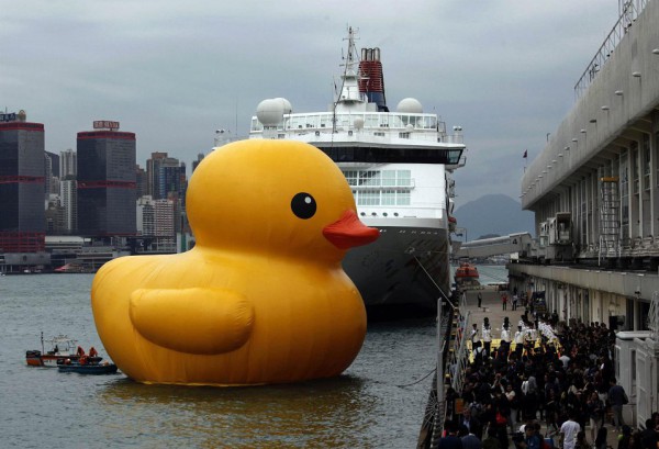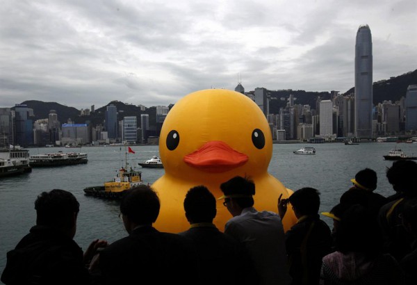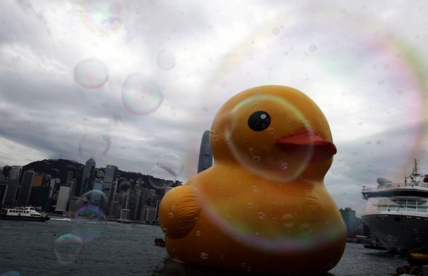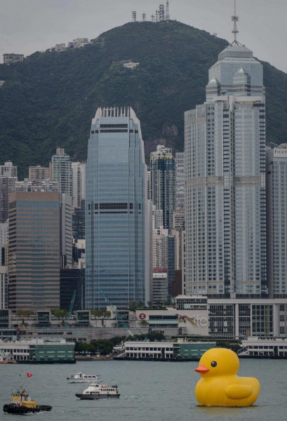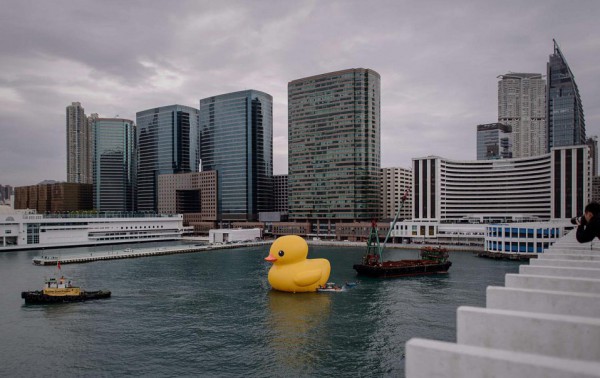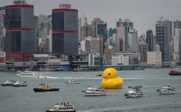 جابت بطة مطاطية عملاقة يبلغ ارتفاعها 16 مترا ميناء فيكتوريا في هونغ كونغ قام بصنعها الفنان الهولندي هوفمان