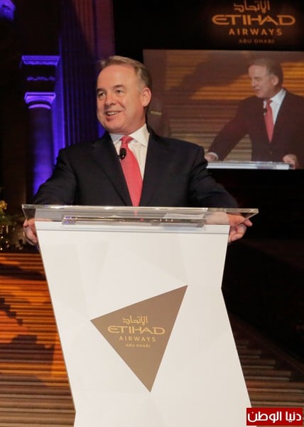 تقدم جيمس هوجن، رئيس المجموعة والرئيس التنفيذي للاتحاد للطيران، بالشكر لسعادة يوسف العتيبة لما قدمه من دعم أثناء تدشين الشركة لرحلتها إلى سان فرانسيسكو وتحدث أيضاً عن العلاقة القوية التي تربط الشركة بالولايات المتحدة.