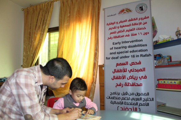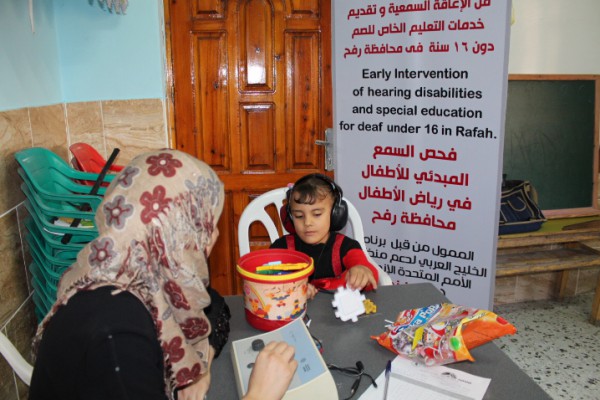 ضمن مشروع الكشف المبكر والوقاية من الإعاقة السمعية وتقديم خدمات التعلم الخاصة دون 16 سنة والذي تنفذه جمعية الأمل لتأهيل المعاقين –رفح بتمويل من برنامج الخليج العربي للتنمية (أجفند) .تم فحص أكثر من 2636خلال الشهريين الماضيين وانه جاري العمل علي قدم وساق من أجل فحص سمع وعلاج نطق لرياض الأطفال في المحافظة الجنوبية .