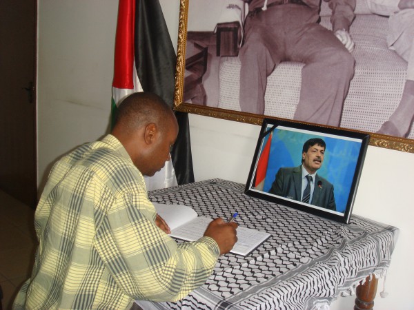 وفي نفس السياق ومنذ صباح اليوم توافدت الوفود على سفارة دولة فلسطين في دار السلام من سفراء ودبلوماسيين ورؤوساء احزاب وجمعيات اسلامية ومسيحية واصدقاء لتقديم التعازي ،حيث اعلنت سفارة دولة فلسطين في تنزانيا عن استقبال التعازي على مدار يومين.
