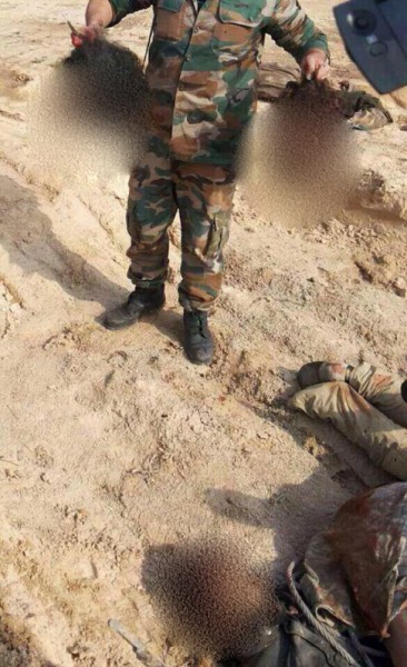 قد إنتشرت في الايام القليلة الماضية، العديد من صور التي تظهر جنودٍ سوريين من أفراد الحماية في المطار وهم يحملون سيوفاً، ويقومون بإستعراض جثث قتلى منها مقطوعة الرؤوس، فيما أظهرت صورةٌ أخرى قيام جندي سوري بإستعراض نفسه ممسكاً برأسين لمقاتلين تم قطعهما، وامامه عدداً آخر من الرؤوس المقطوعة، هذا فضلاً عن إستعراض مئات الجثث التابعة لمقاتلي التنظيم عبر وضعها في شاحناتٍ والتجول بها في شوارع بعض احياء المدينة الخاضعة لسيطرة الدولة، او تعليقها على شاحناتٍ صغيرة وعرضها كما سحبها في الشوارع وتصوير ذلك ونشره، ما رتب حالة جديدة من الحرب النفسية التي بدأ يشنها الجيش على الارهابيين موجهاً رسالةً ضمنيةً لهم، ان “مصيرهم مصير هؤلاء، واسلوب القتل هو نفسه”، فداعش بات يشرب من نفس الكأس.