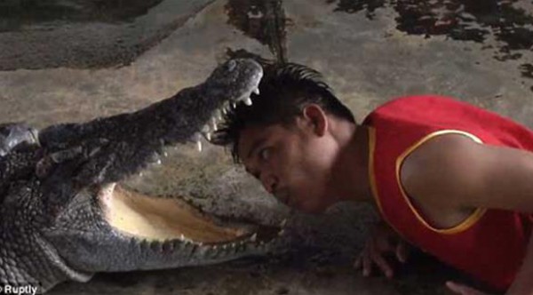 ففي صورة يظهر رجل يضع رأسه داخل فكي تمساح لمدة ثوانٍ معدودة قبل أن يسحبها مرة أخرى للخارج، وفي صورة أخرى يظهر زميله أكثر شجاعة إذ يؤدي نفس العرض لكن مع الابتسام والتلويح لزوار الحديقة وكأنه يضع رأسه بين فكي دمية على شكل تمساح.