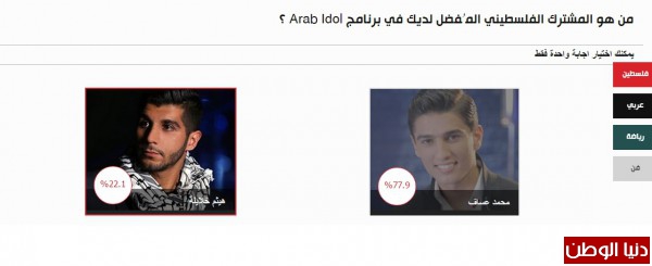 حصل الفنان الفلسطيني محمد عساف على أعلى نسبة تصويت في الساعات الأولى من اطلاق "استفتاء دنيا الوطن" في سؤال :" المشترك المفضل في Arab Idol" مقارنة بزميله هيثم الخلايلة.