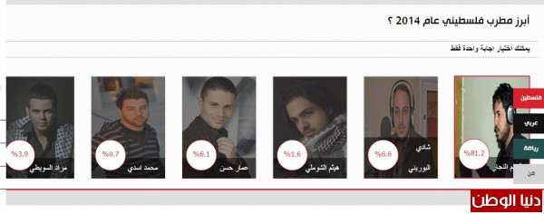 كما تصدر قاسم النجار قائمة أبرز الفنانين الفلسطينيين بنسبة 81% من بين 6 مطربين آخرين .