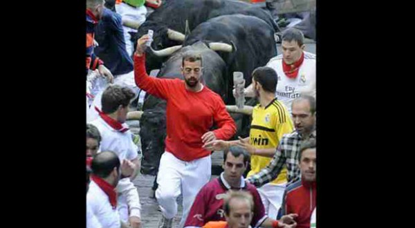 رجل خلال هروبه من ثيران هائجة في تقليد إسباني يعود لأكثر من 400 عام
