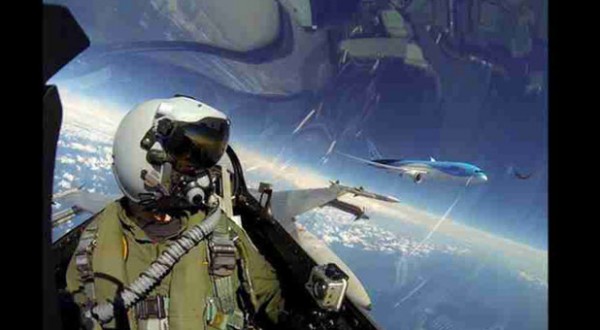 طيار من سلاح الجو الهولندي خلال تحليقه بجوار طائرة بوينج من طراز دريملايز 787