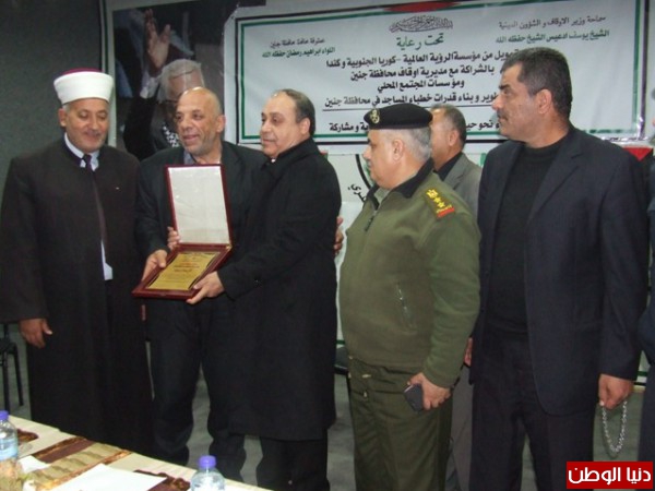وفي نهاية الافتتاح قدم محافظ محافظة جنين درعاً تكريماً لوزير الأوقاف والشؤون الدينية سماحة الشيخ يوسف ادعيس تسلمه عنه وكيل مساعد وزارة الأوقاف.
