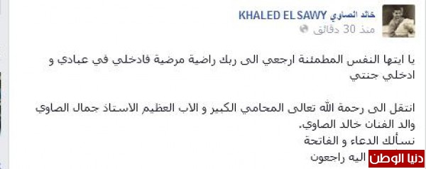 توفي في الساعات الأولى من صباح اليوم الثلاثاء، المحامي جمال الصاوي، والد الفنان خالد الصاوي، وذلك بعد أن أعلنت الصفحة الرسمية للفنان خالد الصاوي خبر الوفاة عبر "فيسبوك" .