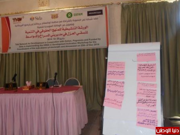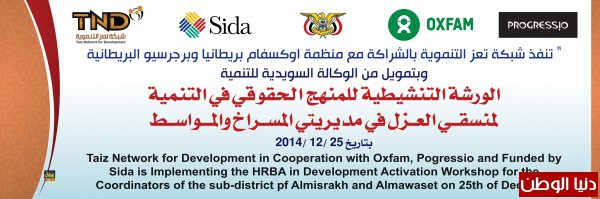 في اطار تنفيذ مشروع تعزيز المشاركة المجتمعية والحكم الرشيد تنفذ شبكة تعز التنموية TND الورشة التنشيطية للمنهج الحقوقي في التنمية لمنسقي العزل في مديريتي المسراخ والمواسط ، حيث سيحضر ورشة العمل 30 شخص ، وتهدف ورشة العمل الى تحديث اولويات خطط العزل وفقا لحقوق الانشان لتي كلفها الدستور اليمني و الاتفاقيات والمواثيق الدولية ومخرجات الحوار الوطني الشامل .