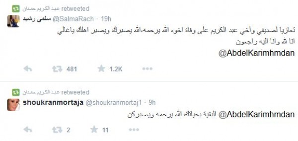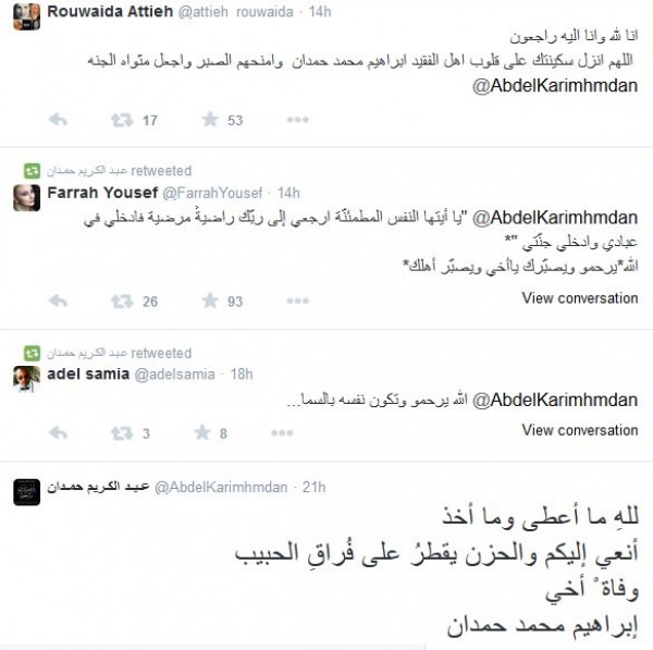 عدد من صديقات عبد الكريم قدمن التعازي له منهم رويدا عطية التي قالت: “انا لله وانا اليه راجعون اللهم انزل سكينتك على قلوب اهل الفقيد ابراهيم محمد حمدان وامنحهم الصبر واجعل مثواه الجنه”.