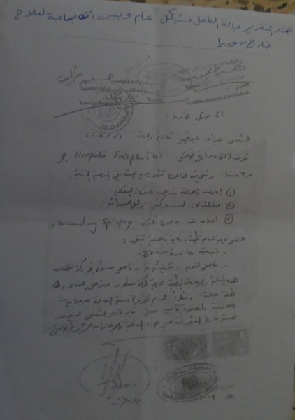 و وقول التقارير الطبية بعد اجراء صور وتحاليل مخبرية للطفل جواد في مستشفى حمود انه بحاجة ماسة لزرع جهاز بكلفة 25000 دولار امريكي لتخفيف الكهرباء في جسده و راسه مما يقلل من نوبات الصرع التي يعاني منها.