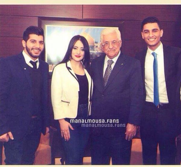 شاركت الفنانة الفلسطينية منال موسى جمهورها بصورة رائعة جمعتها بالرئيس الفلسطيني محمود عباس وأبناء بلدها الفنانين محمد عساف وهيثم خلايلة.