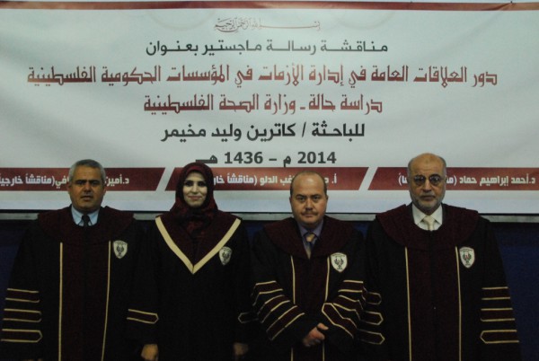 جاءت تلك الدراسة خلال مناقشة رسالة ماجستير في قسم القيادة والإدارة اليوم الثلاثاء، في قاعة المؤتمرات بجامعة الأقصى في غزة، للباحثة كاتريـن وليد مخيمـر، بعنوان، "دور العلاقات العامة في إدارة الأزمات في المؤسسات الحكومية الفلسطينية- وزارة الصحة الفلسطينية دراسة حالة" في برنامج أكاديمية الإدارة والسياسة للدراسات العليا بمدينة غزة المشترك مع جامعة الأقصى، والتي بموجبها منحت لها درجة الماجستير من قبل لجنة المناقشة والحكم التي تضم كل من الدكتور أحمد حماد مشرفاً ورئيساً، والدكتور أمين وافي مناقشاً داخلياً والأستاذ الدكتور جواد الدلو مناقشاً خارجياً.
