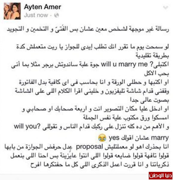 كما أضافت قائلة "أو ادخل عليا مكان التصوير أنت وأربعة صحابك أو صحابى وامسكوا ورق مكتوب عليه نفس الجملة، والأهم تنزل على ركبك قدام الناس وتقوللى ?will you marry عشان أقولك yes، أنا بحذرك أهو لو معملتليش proposal عِدل حرفض الجوازة من بابها، قولوا تافهة قولوا ضايعه قولوا اللى أنتوا عايزينه بس غحنا اللى بنعمل ذكرياتنا وأنا قررت اعمل الذكرى اللى كل ما حفتكرها أفرح".