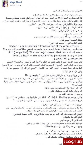 تعيش النجمة اللبنانية مايا نصرى حالة نفسية سيئة، بعدما أخبرها الطبيب المعالج أن ابنها “جوفانى” التى هى حامل به حاليًا يحتاج لعملية قلب مفتوح خلال الـ10 أيام الأولى من ولادته، حيث إنها الآن فى أواخر الشهر الثامن من الحمل، لكن الطبيب أخبرها أن الطفل سيولد بتشوه خلقى فى القلب والأوعية الدموية ويعنى أن الشريان الأورطى يخرج من البطين الأيمن والشريان الرئوى من البطين الأيسر، وبذلك العائد الوريدى من الدورة الدموية الطرفية يتم إعادة ضخه من البطين الأيمن عبر الشريان الأورطى إلى الدوران المجموعى دون أن يكون مؤكسد من الرئتين.