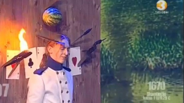 تعين على مساعد رامي السكين الوقوف أمام لوح خشبي وقد استقرت بطيخة فوق رأسه، لكن الرامي فشل في ضبط الزوايا والاتجاهات، وبدلاً من أن يصيب البطيخةأصاب مساعده في يده تارة وفي رأسه تارة أخرى أمام مرأى من اللجنة والمشاهدين، بحسب صحيفة دايلي ميل البريطانية.
