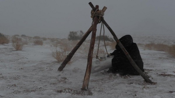 عاصفة "زينة" و"هدى" التي خلفت وراءها ثلوجا ودرجة حرارة متدنية، لم تمنع هذه المرأة من نصب ثلاث قطع خشبية مربوطة في رأسها بحبل يتدلى في المنتصف، ليمسك بآلة إعداد الحليب، فيما تظهر هي متسمرة تكابد قسوة الصقيع، متلحفة عباءة سوداء، تظهر متجلية وسط منظر البياض الذي يلف المكان بفعل تساقط الثلوج.