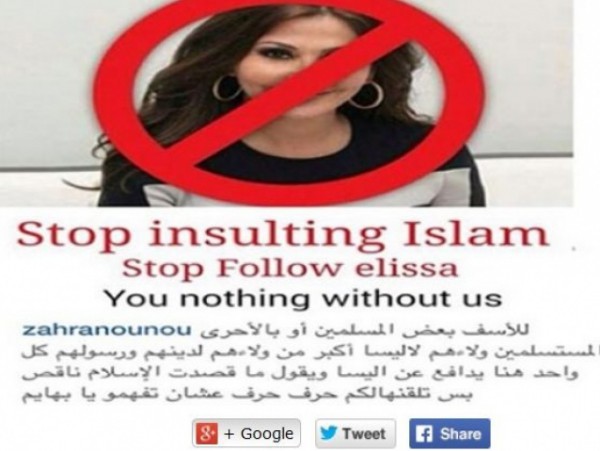 على موقع التواصل الاجتماعي تويتر شن عدد من المتابعين حملة ضد النجمة اللبنانية إليسا، بسبب صورة نشرتها إثر حادث صحيفة "شارلي ايبدو" الفرنسية التي أسفر عنها مقتل 12 صحفيًا، باعتبار أنها تسيء للمسلمين بالصورة التي كانت عبارة عن قلمين تخترقهما طائرة، في إشارة إلى حادث 11 سبتمبر، وكتبت عليها مؤكدة أن الحبر هو الذي يجب أن يراق وليس الدماء، ولكن بعض متابعيها فسروا الصورة على أنها اتهام للمسلمين بارتكاب حادث 11 سبتمبر، وهو الأمر الذي أثار مشكلة كبيرة من المؤيدين لموقف إليسا والرافضين لموقفها.