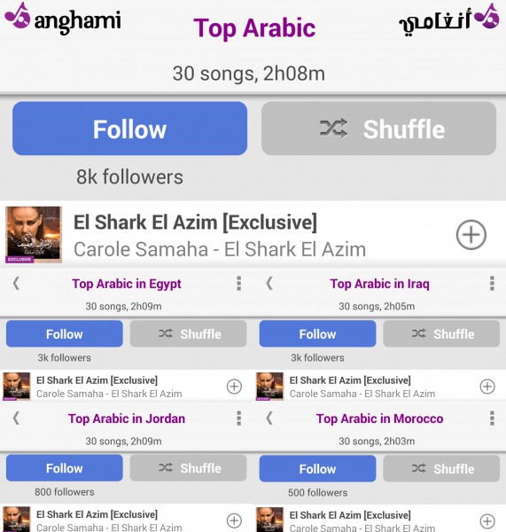 بعد أقل من أسبوع على صدور العمل الضخم "الشرق العظيم"، للنجمة وسفيرة النوايا الحسنة لدى الشبكة الدولية للحقوق والتنمية (GNRD) كارول سماحة، إحتلت الأغنية المرتبة الأولى ضمن فئة الأغنية العربية عبر تطبيق أنغامي وذلك في الأردن، المغرب، العراق ومصر. فيما إحتلت المرتبة الثانية في قطر، المملكة العربية السعودية والإمارات.