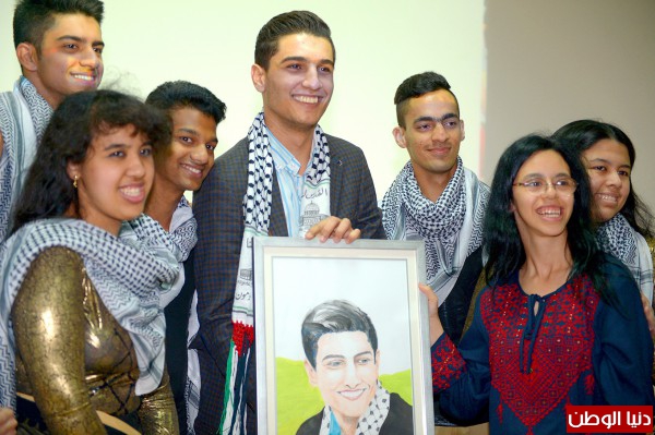 كما قام الفنان وبعد تسلمه الدرع التكريمية من السيدة مريم عثمان وتسلمه هدية من أحد الطلبة وهو صندوق خشبي مزخرف يحتضن القرآن الكريم، بتوقيع كوفية فلسطينية ليقوم المركز بادراجها ضمن مزاد النجوم الذي من المقرر إقامته في 24 نوفمبر المقبل لصالح المركز.