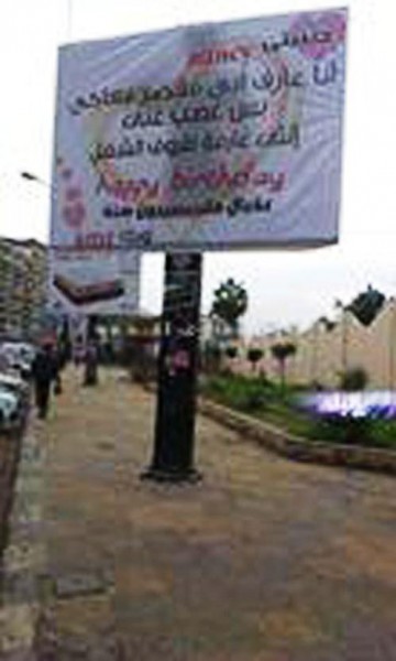 وكتب الزوج الشاب على اللافتة والتي تحمل خلفية قلب كبير “حبيبتي nancy أنا عارف إني مقصر معاكِ بس غصب عني أنتِ عارفه ظروف الشغل happy birth day عقبال مليون سنة (زوجك amr)”.